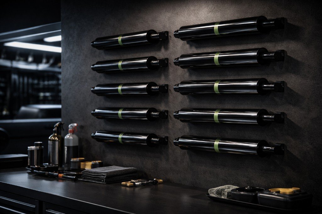 Brackets, hubs, and holders are staged for fast assembly, easy replacement, and clean shop-wall expansion.