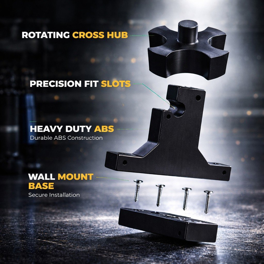 Rotating cross hub, precision fit slots, heavy duty ABS body, and wall mount base are called out for quick field reference.